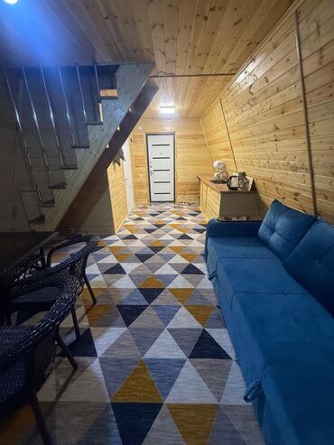 - Деревянные стены и потолок, уютная атмосфера, компактная планировка.