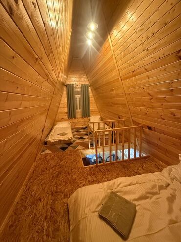 А‑фрейм домик с полностью деревянной отделкой внутри.