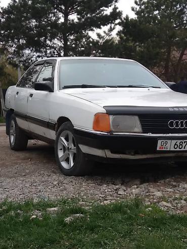 Audi 100 (C3) седан, белый, правый и левый приводные двери с черными молдингами. Кузов с черными бамперами и накладкой на кромке капота с надписью Audi. Литые 5‑спицевые диски, передние и задние дисковые тормоза, тонированные стекла. На задних колесах установлены широкие брызговики (синие сзади справа). Антенна на заднем крыле. Передняя оптика прямоугольная, поворотники оранжевые, задние фонари комбинированные. Номерные знаки KG.