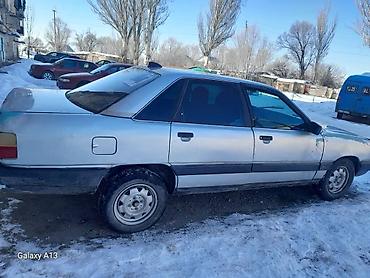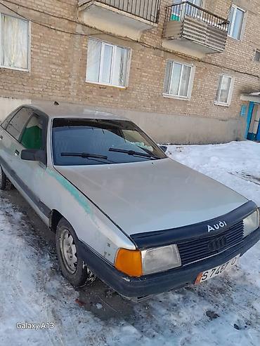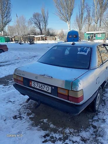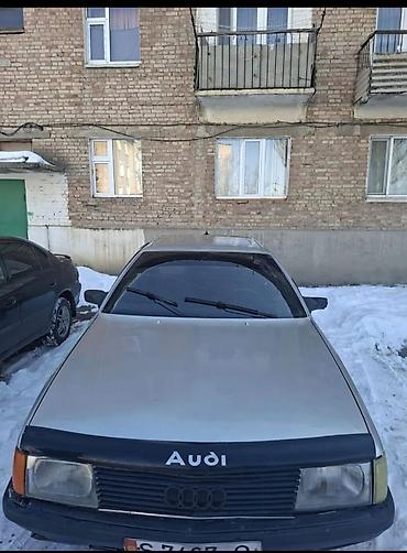 Audi 100 C3, седан, белый цвет. Передняя оптика прямоугольная, решётка с эмблемой Audi, черный передний бампер. На капоте установлен ветровик/дефлектор с надписью Audi. Лобовое с тонировкой верхней...