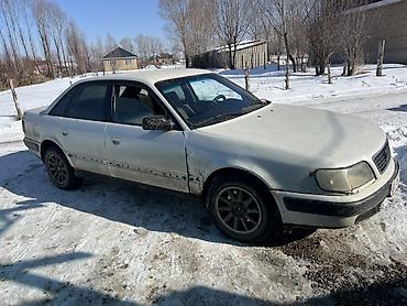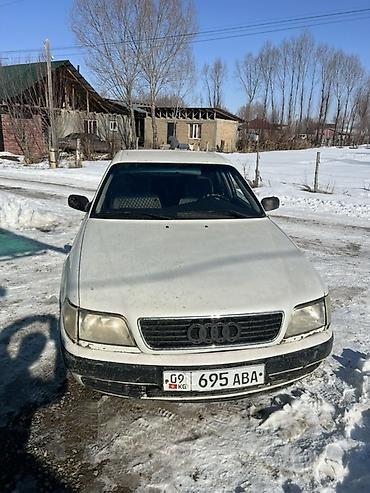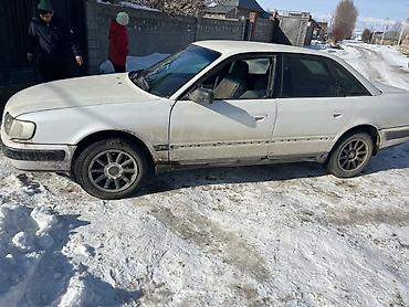 Audi 100 C4 седан, белый цвет. Бензиновый двигатель 2 моно (эмблема 2 на крышке багажника), передний привод. Кузов 4-дверный, колесные диски легкосплавные, зимняя резина на фото. Оптика: прямоугольные фары, задние фонари раздельные с центральной накладкой. Салон тканевый, тонировка задней полусферы. Наружные зеркала с электронастройкой (по корпусу видны повторители регулировки). Номерные знаки KG.