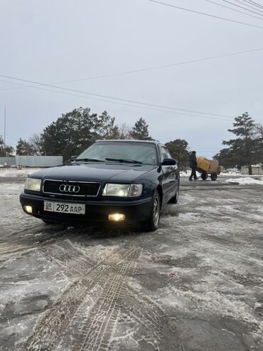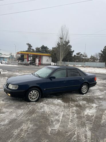 Audi 100 C4 седан, тёмно‑синий цвет. Классический кузов с ровными линиями, оригинальная решётка радиатора Audi, штатные передние противотуманные фары, легкосплавные диски. Задние фонари красно‑оранжевые, выхлопная труба сзади справа, тонированные стёкла.