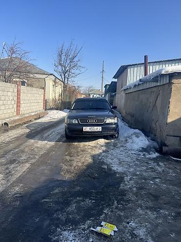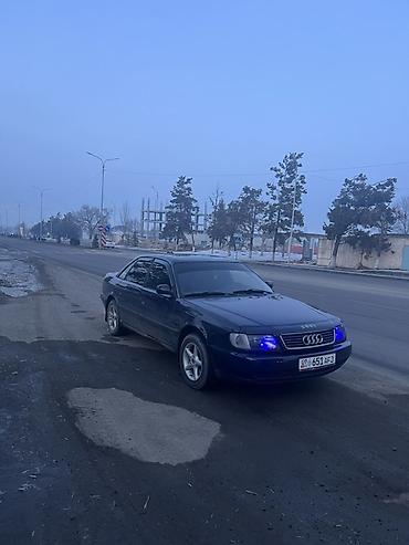 Audi 100/S4 C4, темно-синий седан, 4 двери, номерные знаки KG. Классический кузов C4 с фирменной решеткой и эмблемой Audi, линзованные передние фары с синими ДХО/подсветкой, противотуманные фары. Легкосплавные 5‑спицевые диски, всесезонные шины. Черный салон, тонировка задних стекол. Зеркала и ручки в цвет кузова, хромированная окантовка решетки радиатора.