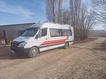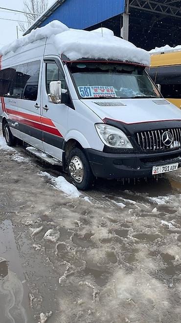 Маршрутный микроавтобус Mercedes‑Benz Sprinter (белый, длинная база, высокий крыша). Назначение и маршрут: - Пассажирские перевозки по межгороду. - Маршрут: 353 «Токмок — Бишкек — Экспресс» (табли...