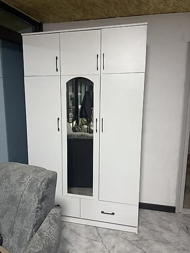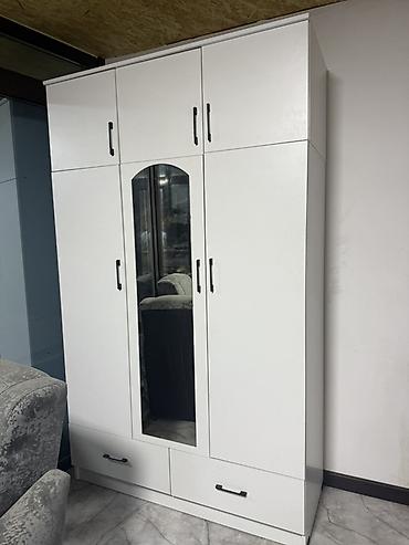 - Предусмотрены секции для хранения: боковые отделения за распашными дверями, центральное отделение с зеркальной дверью, верхние антресоли, нижние ящики — удобно для одежды, постельного белья и аксессуаров.