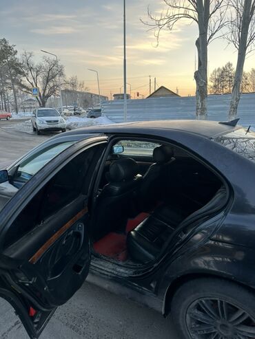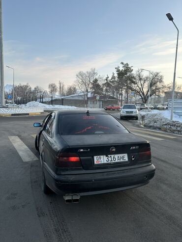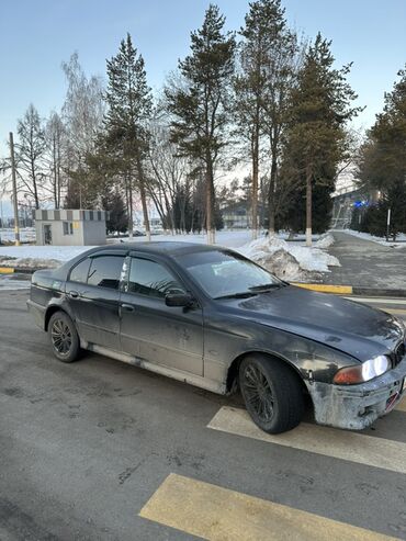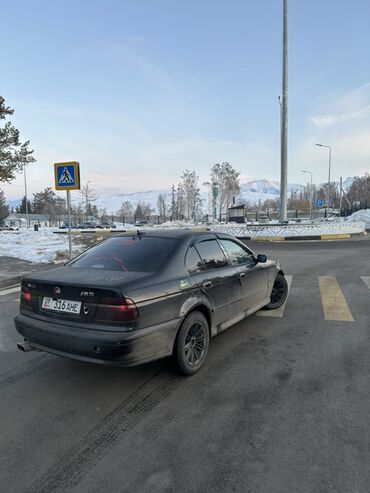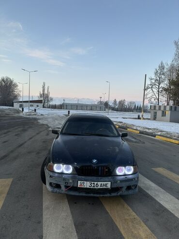 BMW 5 Series E39, седан, черный цвет. На фото – автомобиль с киргизскими номерами (регион 09), тюнингованной внешней оптикой и спортивными акцентами.