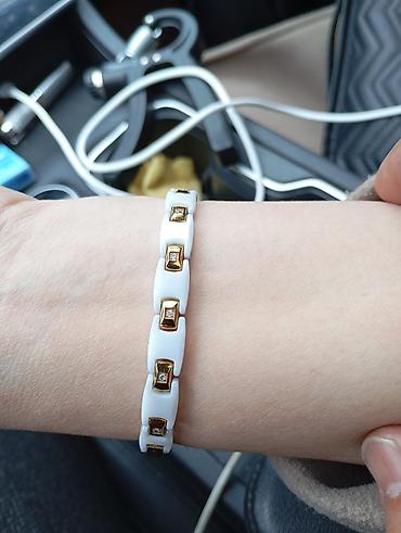 Браслет из белой керамики с вставками под золото и небольшими прозрачными камнями.