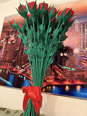 - Состав: красные фетровые розы с зелёной листвой, собраны на длинных стеблях.