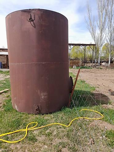 Металлическая емкость-цистерна вертикальная - Материал: сталь, толстостенная. - Форма: цилиндрическая, вертикальная установка. - Примерные габариты по фото: высота около 1,2–1,5 м; диаметр порядка...