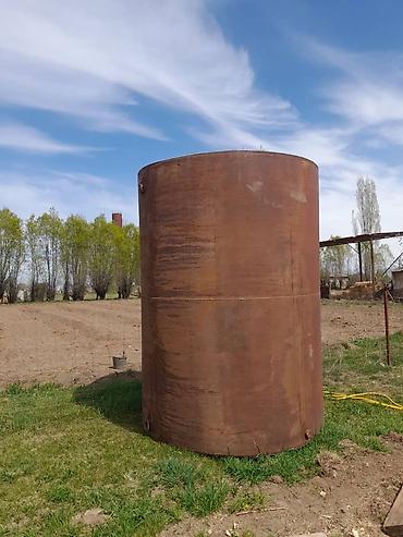 Вертикальная металлическая емкость-цистерна - Материал: металл (сталь), цилиндрическая форма, вертикальная установка. - Ориентировочные габариты по фото: высота около 2–2,5 м, диаметр около 0,8–1 ...