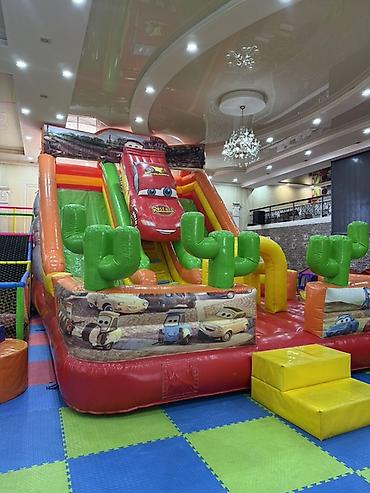 - Большая надувная горка с тематическим оформлением «Тачки», мягкими кактусами-барьерами и безопасными бортами