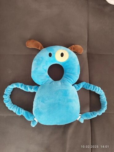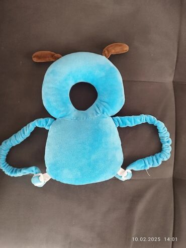 Мягкая подушка-защита для головы ребенка в виде голубого щенка с коричневыми ушами. Подушка имеет отверстие для головы и мягкие ремешки, которые надеваются на плечи ребенка. Предназначена для смягчения ударов при падении, защищая голову и спину малыша во время ползания и первых шагов.