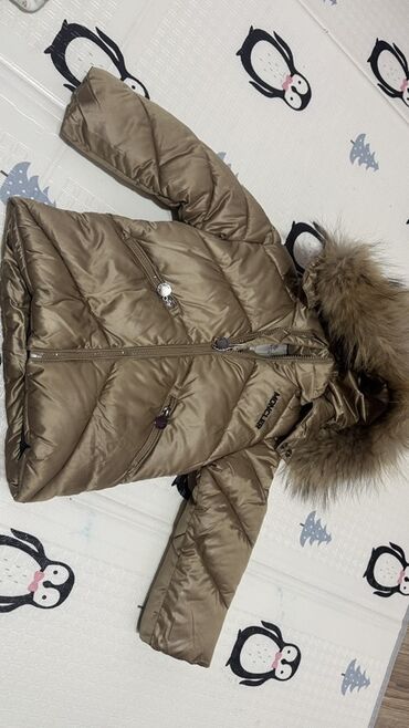 1) Зимняя куртка-пуховик, цвет бронзовый/оливковый на 1,5-2 года , объёмный капюшон с густой опушкой из искусственного меха MONCLER