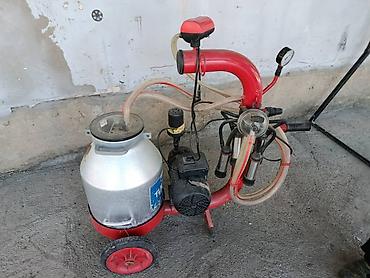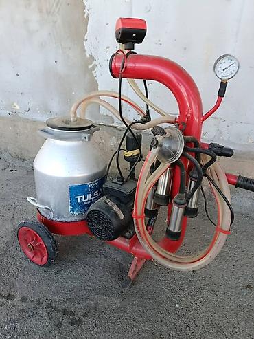 Мобильный доильный аппарат TULSA, предназначенный для эффективного и удобного доения. Устройство включает в себя металлический бидон для сбора молока, вакуумный насос и доильные стаканы. Оборудование установлено на прочной раме с колесами, что обеспечивает легкое перемещение. Присутствуют манометры для контроля давления в системе. Красный цвет рамы и некоторых компонентов делает аппарат заметным.