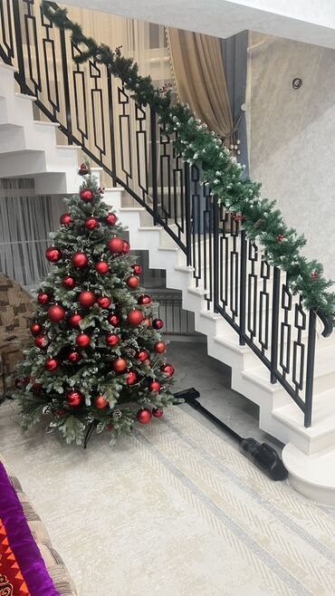 - Просторная гостиная с лестницей и праздничным декором, ёлкой и гирляндами.