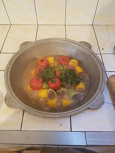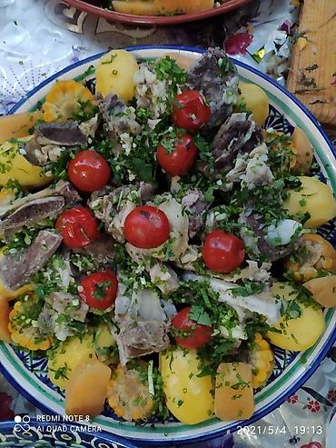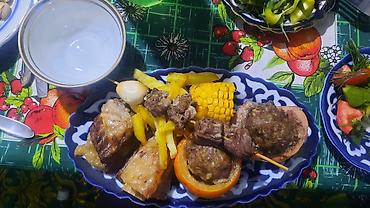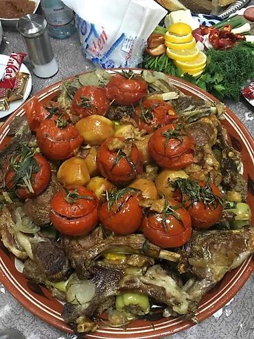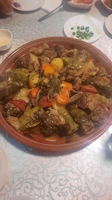 - Джиз/каурма и ассорти из мяса с овощами: сочные куски мяса, томлённые с картофелем, морковью, перцем, луком, томатами, пряными травами. Большая подача на общем блюде.