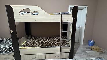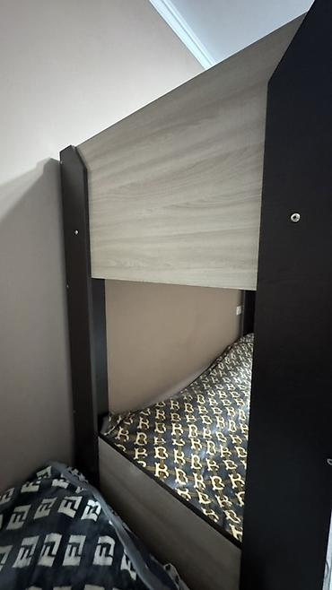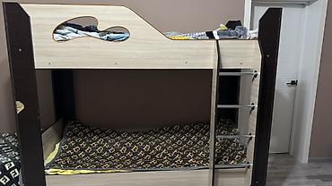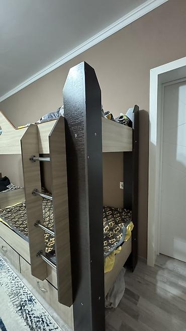 Габариты ориентировочно по фото: длина около 2 м, высота около 1,6–1,7 м, ширина ~90–100 см (под стандартные односпальные матрасы).