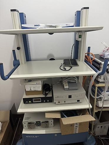 - Стойка Aesculap с несколькими полками и держателями для кабелей/инструментов.