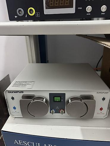 - Ирригационный насос Olympus SurgiPump: панель управления с двумя прижимными роликами для перистальтических магистралей, центральный блок управления с клавишей питания, цветовые порты для подачи/отвода, индикация направления потока.