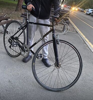 Городской велосипед-синглспид (фикс или свободное колесо — задняя втулка одноступенчатая). Черная стальная рама с прямой горизонтальной верхней трубой, бренд на раме: Dancer. Колеса 28"/700C с узкими шоссейными покрышками. Передний ободной тормоз с выносным тросом и легким калипером, задний тормоз отсутствует. Прямой руль с грипсами, вынос под резьбовую вилку. Платформенные педали, одна звездочка спереди и одна сзади, цепной привод без переключателей — минимализм и низкое обслуживание. Легкий и быстрый вариант для города и велодорожек.