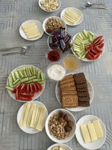 - Питание/перекусы: на столах — нарезка овощей (огурцы, помидоры), сыр, печенье, орехи, бананы, варенье, сахар, напитки, а также шоколадные батончики.