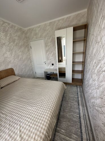 - Мебель и хранение: шкаф с зеркалом и открытыми полками, прикроватные тумбы, рабочий стол.