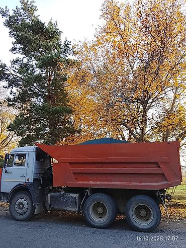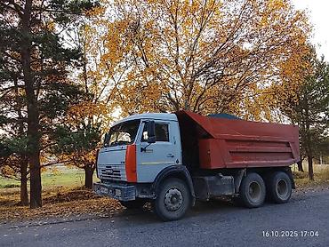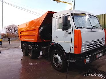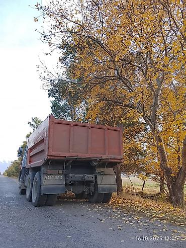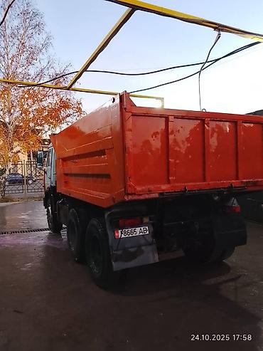 Самосвал с оранжевым кузовом, предназначенный для перевозки сыпучих материалов. Оснащен двойными задними колесами для улучшения устойчивости и грузоподъемности. Задние фонари и брызговики обеспечив...