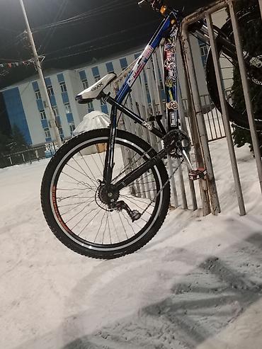 - Рама: стальная/ хардтейл, размер ближе к M, прямые трубы, наклейки на верхней/подседельной/нижней трубах. V-brake крепления присутствуют, установлены дисковые тормоза спереди.