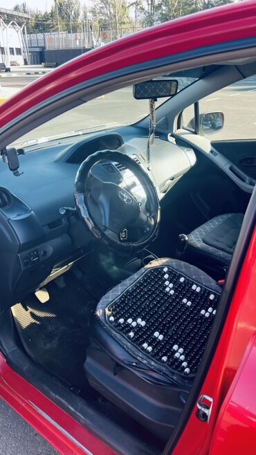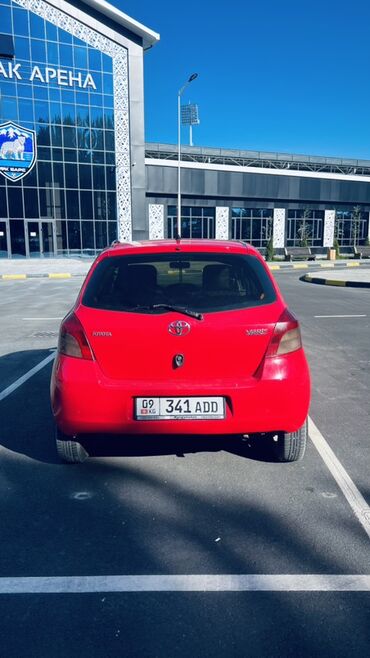 Toyota Vitz (Yaris) хэтчбек, красный цвет кузова. Компактный городской автомобиль с экономичным бензиновым двигателем и передним приводом.