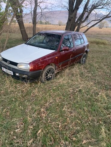 Volkswagen Golf III, 5‑дверный хэтчбек, бордовый цвет с контрастным белым капотом. Компактный городской автомобиль с практичным салоном и хорошей обзорностью.