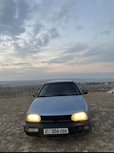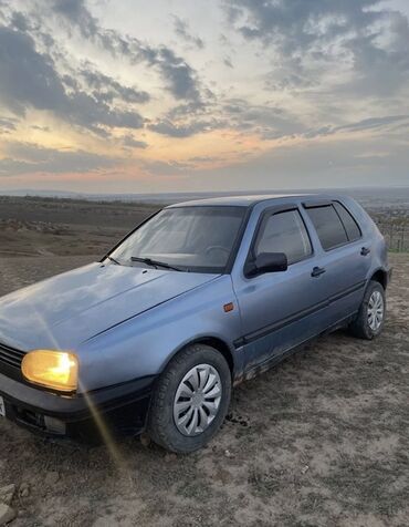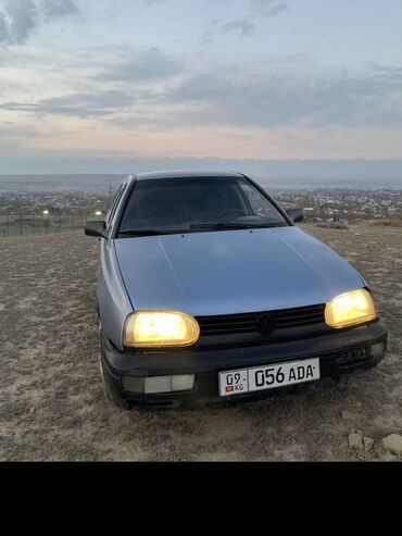 Volkswagen Golf III, хэтчбек, синиий цвет кузова. Передний привод, бензиновый двигатель, механическая коробка передач. Фары с галогенными лампами, передний бампер с интегрированными противотуманными секциями, фирменная эмблема VW на решетке.