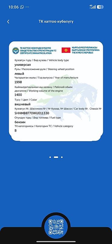 Honda — универсал, левый руль. Год выпуска: 1998. Двигатель бензиновый, рабочий объем 1.4 л. Цвет: вишневый. Категория ТС: B. VIN/номер кузова: SHHMB8770WU011330.