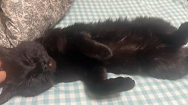 Котёнок, чёрный короткошёрстный - Возраст: примерно 5–8 месяцев (молодой активный котёнок). - Окрас: однотонный чёрный с небольшим белым пятнышком на груди. - Глаза: янтарные. - Шерсть: гладкая, п...