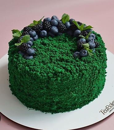 Яркий, эффектный и невероятно нежный. Бархатные изумрудные коржи с мягкой сладостью и тонким сливочным вкусом покоряют с первой вилочки, а свежая голубика и ежевика добавляют сочность и лёгкую ягодную кислинку.