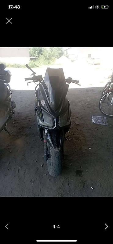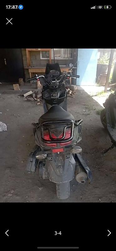 Карбюратор надо починить Скутер/мопед, чёрный, спортивный дизайн кузова. Передняя оптика — двойные фары со светодиодными ходовыми огнями, высокий тёмный ветровик. Широкие внедорожные покрышки с выраженным протектором, телескопическая передняя вилка с защитными чехлами. Тормоза: передний дисковый. Приборная панель с центральным спидометром, отдельные индикаторы. Удобное двухместное сиденье, ровный пол для ног. Сзади — крупный комбинированный фонарь, поворотники, прочный багажник-турник для крепления груза/ кофра. Выведенная сбоку выхлопная система. Есть центральная и боковая подножки, зеркала, ручки пассажира. Хорошо подходит для городских поездок и грунтовых дорог благодаря высокому пластику морды и «толстым» шинам. Цвет пластика — глубокий чёрный с матовыми вставками.