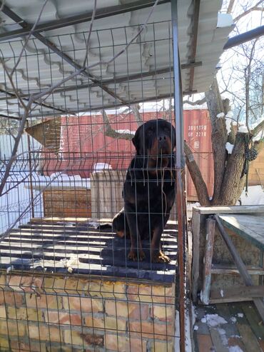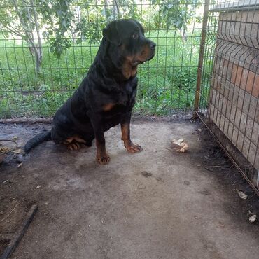 Ротвейлер, кобель. Крупный, мускулистый, с правильной породной головой, мощной грудью и крепким костяком. Окрас чёрный с ярко-рыжими подпалами. Короткая густая шерсть, хвост купирован. На шее прочн...