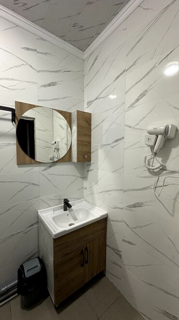 - Тумба с раковиной, смеситель с матово‑чёрным покрытием.