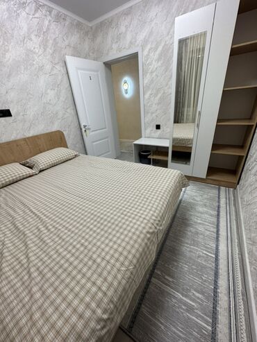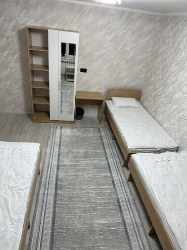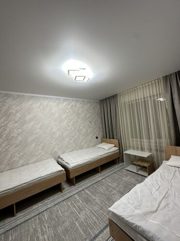 Комната с несколькими спальными местами и базовой меблировкой Описание: - Просторная светлая комната с современным потолочным светильником и панорамными шторами. - Три односпальные кровати с матра...