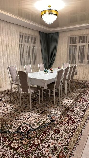- Отдельная светлая столовая зона: большой обеденный стол на 10–12 мест, стулья, панорамные окна с текстильными портьерами.