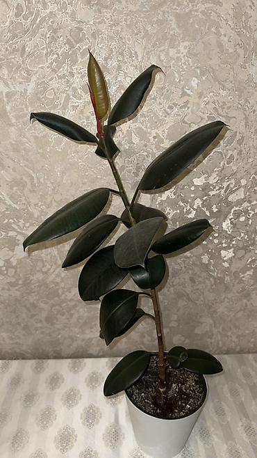 - Глянцевые тёмно‑зелёные крупные листья, верхушка с молодым красноватым листом.