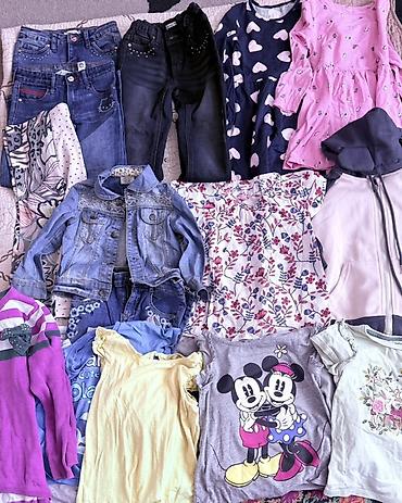 За все 300 сом.Детский комплект одежды для девочки, сборный лот. В набор входят: - Джинсы с декоративными блестками. - Несколько футболок/лонгсливов с принтами: цветы, надписи, персонажи, рисунки ...