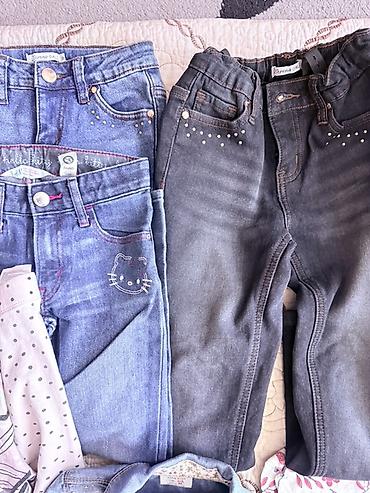 - 3 пары джинсов/джеггинсов: синие с вышивкой “Hello Kitty”, синие с мелкими клёпками, тёмно‑серые джеггинсы с клёпками на поясе.