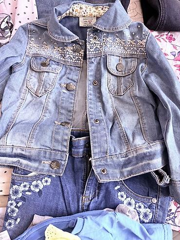 Комплект детской одежды (для девочки, предположительно рост около 128–140 см по визуальным пропорциям): 1) Джинсовая куртка №1 - Классический крой с воротником, контрастная прострочка - Эффект вар...