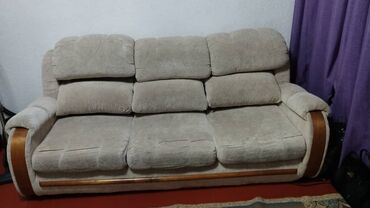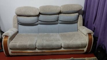 Комплект мягкой мебели: трехместный диван и два широких кресла.