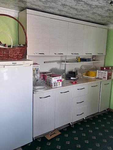 - Верх: длинная линия навесных шкафов с распашными фасадами.