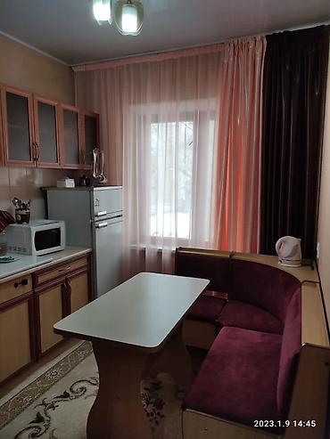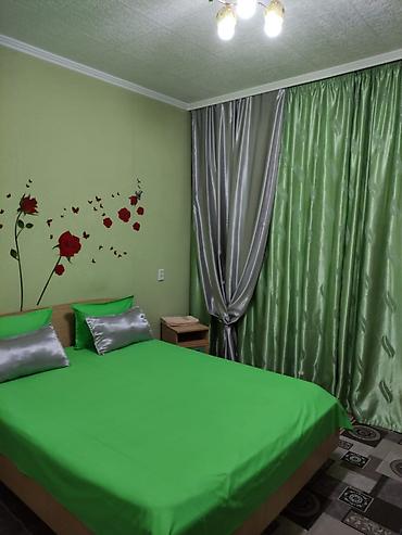 Предлагается в аренду квартира, включающая в себя спальню, кухню, туалет и душевую. В спальне расположена двуспальная кровать с зеленым покрывалом и двумя подушками, прикроватная тумбочка и плотные шторы для комфортного сна. Стены в спальне светло-зеленые, одна из них украшена декоративными элементами в виде красных роз и бабочек. Кухня оборудована кухонными шкафами, холодильником, микроволновой печью и обеденной зоной с угловым диваном и столом. Окна на кухне оформлены легкими тюлевыми шторами и плотными портьерами. Санузел раздельный, включает отдельный туалет с унитазом и раковиной, а также душевую комнату с душем и шторкой. Помещения оформлены в нейтральных тонах, что создает уютную и функциональную обстановку.