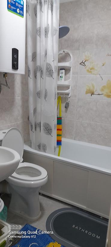 - Санузел совмещённый: ванна с душем, унитаз, раковина, водонагреватель, занавес, полочки для принадлежностей.