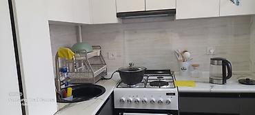 - Современная кухня: газовая плита с духовкой, вытяжка, мойка, сушилка для посуды, электрочайник, рабочая столешница с мраморным рисунком, навесные и напольные шкафы для хранения.