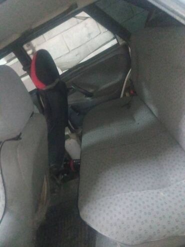 - Салон: тканевая обивка сидений, передние и задние диваны с серым рисунком, чехол на водительском кресле, передние электростеклоподъёмники (механические ручки не видны), коврики.
