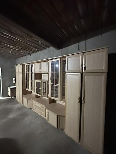 - Предполагаемые размеры (визуально по фото, ориентировочно): ширина порядка 3,5–4 м; высота около 2–2,2 м; глубина секций 40–55 см (центральные тумбы чуть глубже).